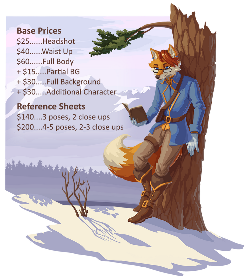 in my portfolio, and in any publications. All commissions are created digitally and delivered at 300dpi, in RGB colour, and in PNG format.The client may use the artwork for personal use. I DO NOT consent to my art being used for AI training or NFTs.This site is for SFW content- some light gore or tasteful nudity is ok, but this is not the place to get overtly sexual content from me.The prices listed are base prices. For very complicated requests I may ask for a larger compensation.You can always contact me for a status update or for any other reason.